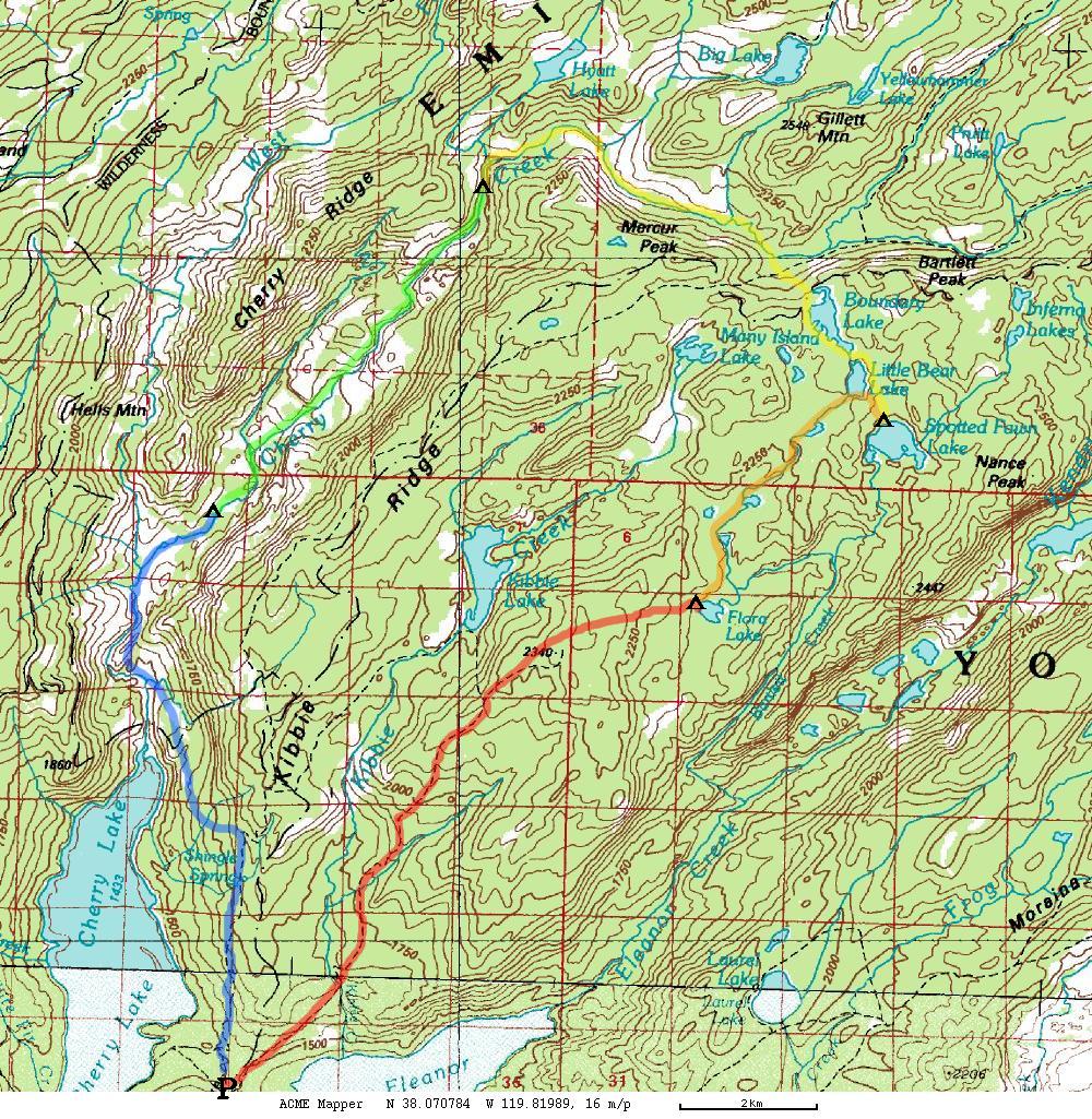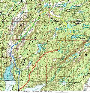 As we pushed our way through thick brush coming down the back side of the hill, the light was beginning to fade. We finally stumbled the last few steps down to Flora Lake just as it was getting dark. We quickly set up camp, had dinner, and passed out in our sleeping bags.